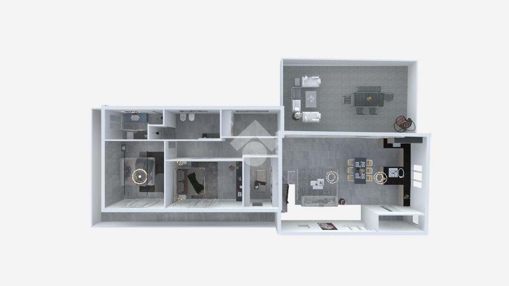 Risulta internamente composto da un ampio e luminoso soggiorno con angolo cottura di circa 47 mq, un ripostiglio, un corridoio, una lavanderia, tre camere da letto e doppi servizi con doccia. Annessi un balcone ed un ampio terrazzo panoramico di circa 40 mq, con splendida vista mare.