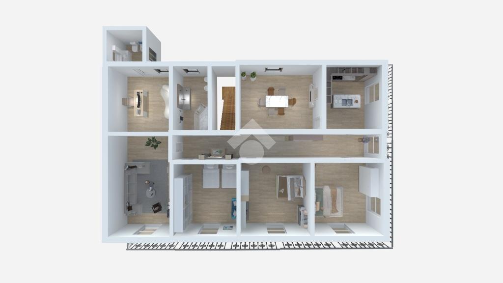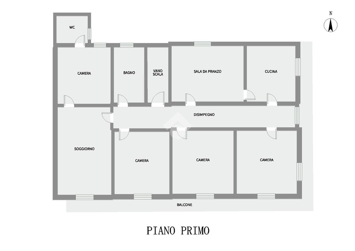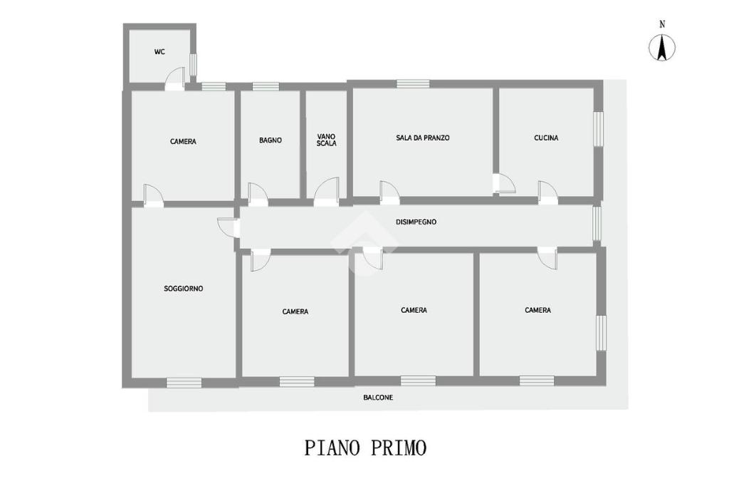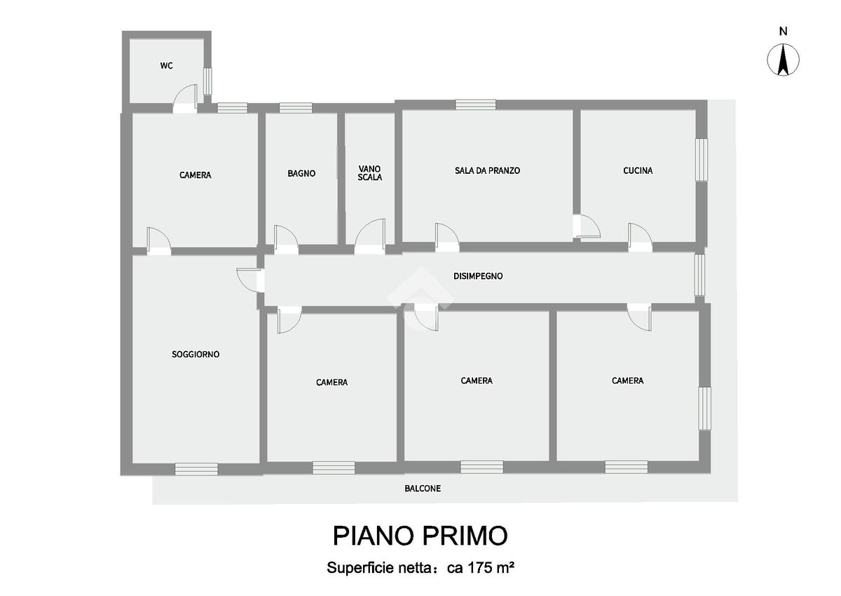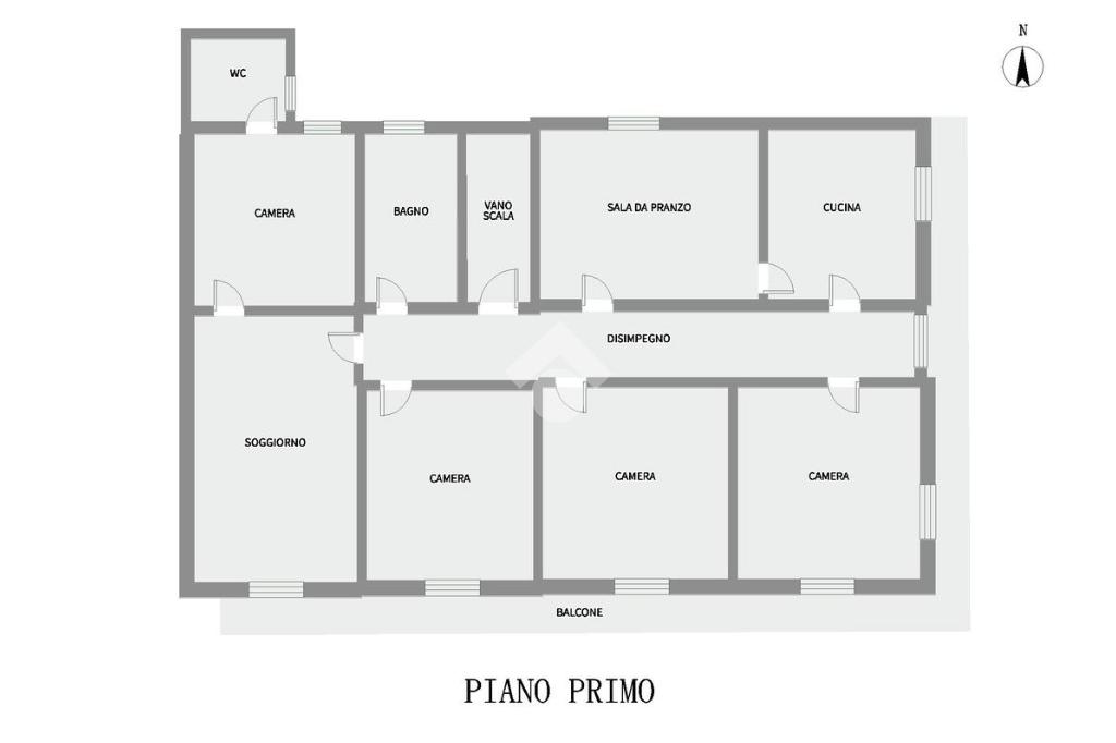 Attraverso una scala interna si accede al piano primo, dove si trova l'abitazione. Con una metratura interna calpestabile di circa 150 mq, l'appartamento comprende una sala da pranzo con camino, una cucina abitabile, un soggiorno, un corridoio, quattro camere da letto e due bagni, di cui uno con vasca. Un balcone perimetrale di circa 25 mq va a completare il piano.