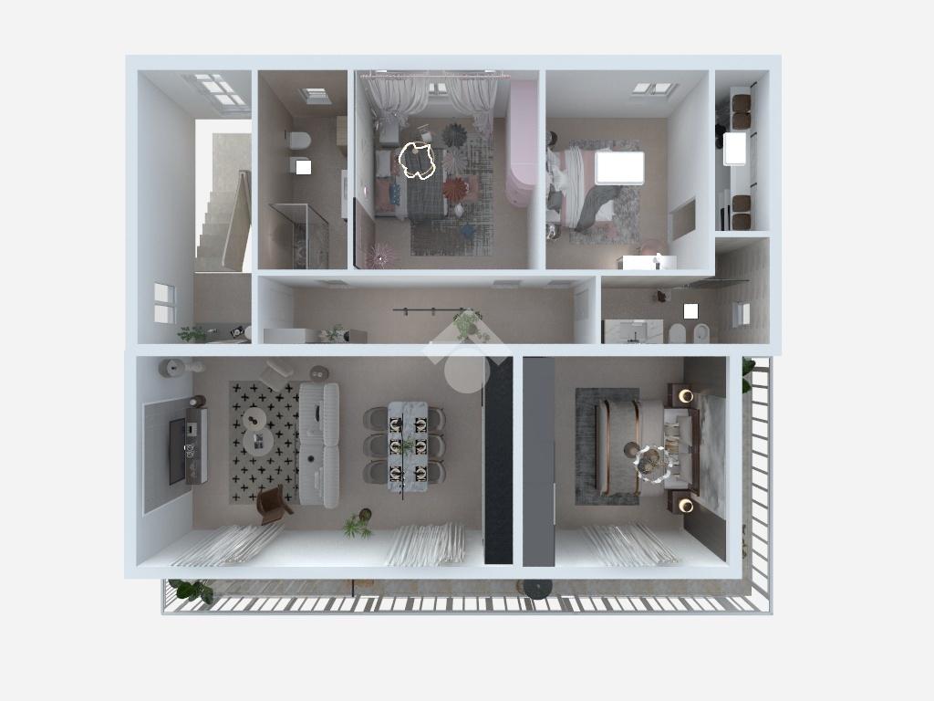 L'abitazione si apre su un ampio ingresso - corridoio, un luminoso soggiorno con angolo cottura ed accesso al balcone, tre comode camere da letto, di cui una con cabina armadio e doppi servizi con doccia. Di pertinenza un'ampia soffitta.