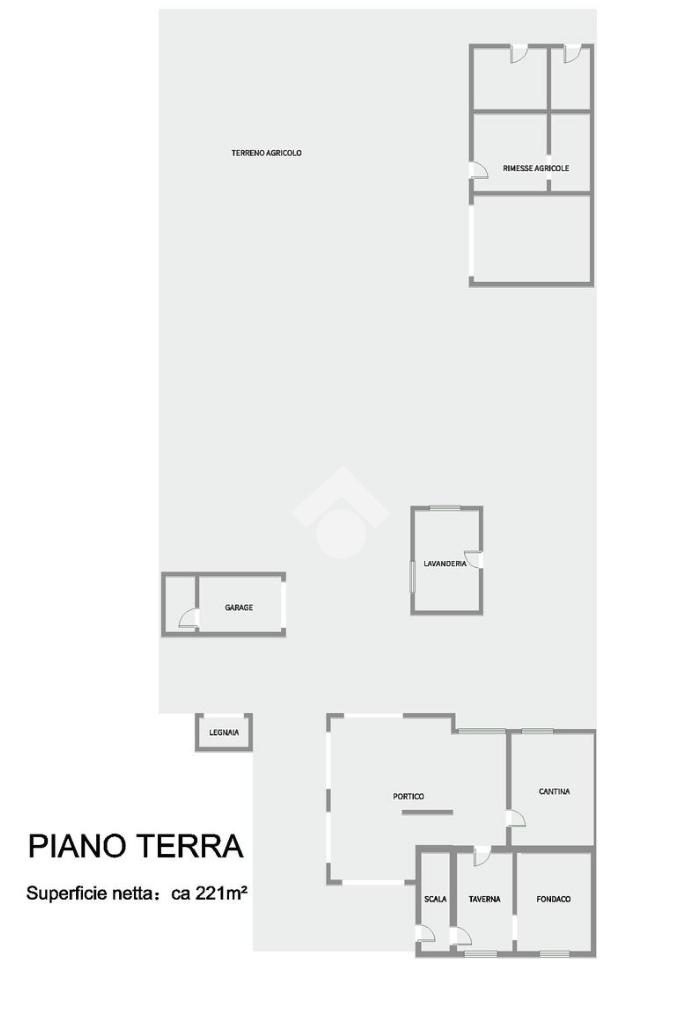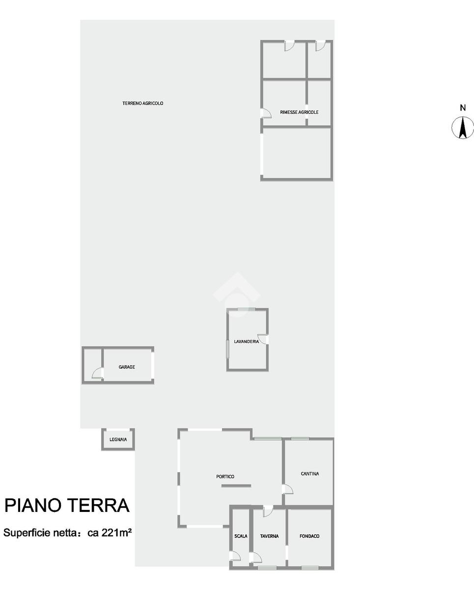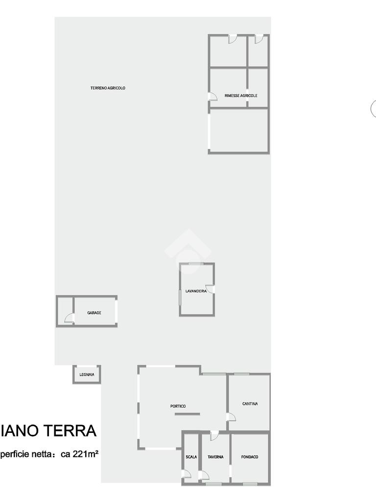 Al piano terra si accede tramite un comodo portico coperto di circa 60 mq, ideale per vivere momenti di relax all'aperto. All'interno troviamo una caratteristica taverna con camino, affiancata da due ampi fondaci adibiti a spazi di servizio.