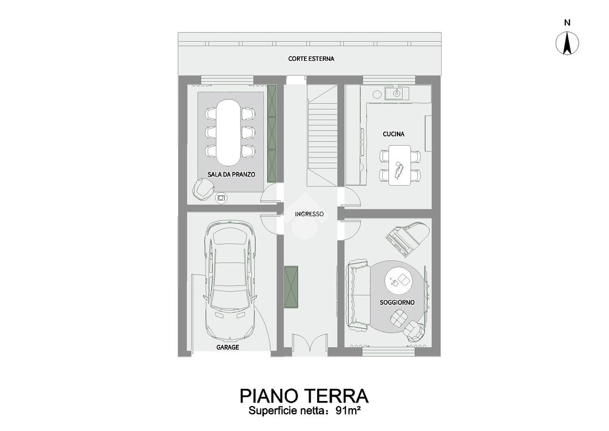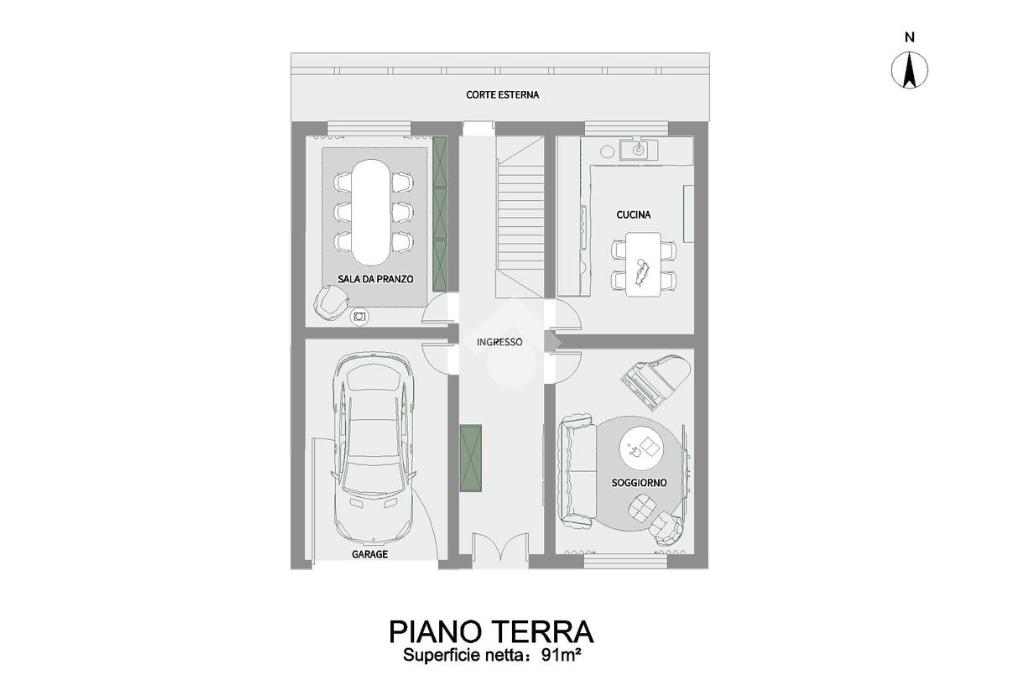 Un ampio corridoio conduce agli ambienti del piano terra, dove troviamo una cucina con camino, un tinello, una comoda dispensa, un bagno di servizio ed un garage di pertinenza.
