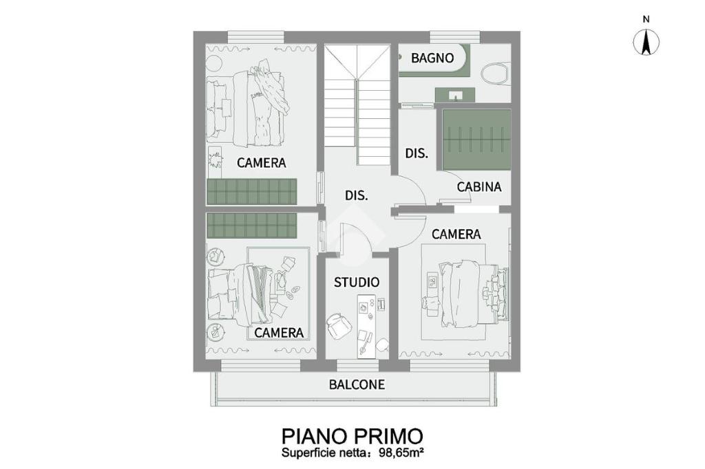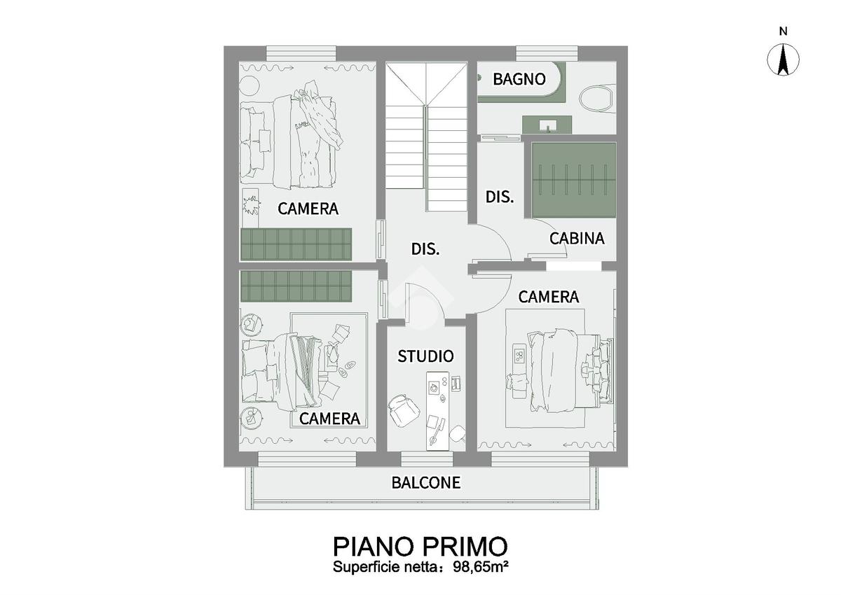 Tramite una scalinata interna si sale al piano primo composto da uno spazioso disimpegno, un luminoso soggiorno, un bagno, tre camere da letto ed un balcone.