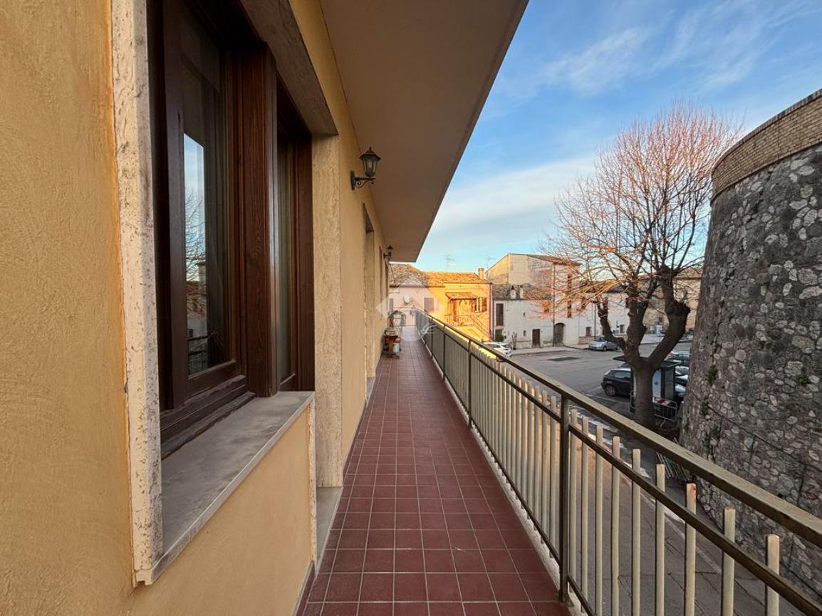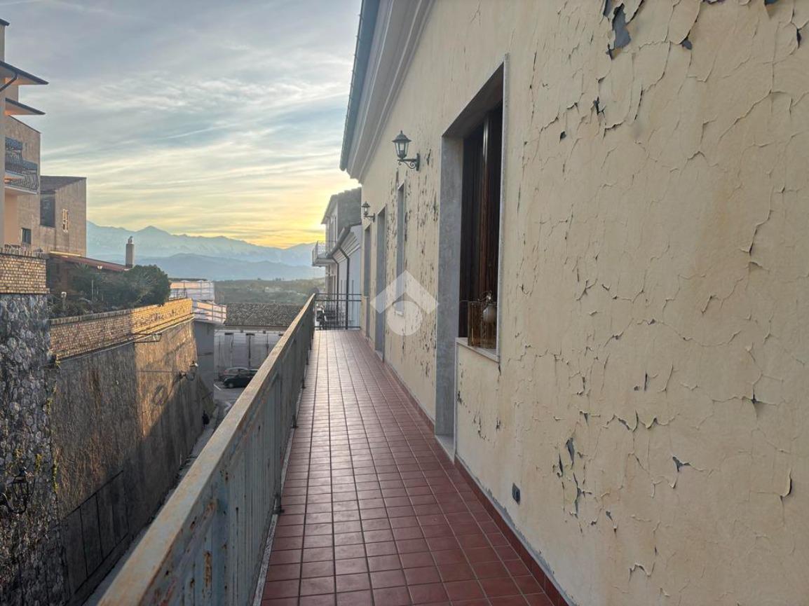 Il primo piano si apre su un ampio corridoio, che conduce ad un doppio living con camino, ad una cucina abitabile, ad una camera da letto e ad bagno con doccia. Un balcone perimetrale di 25 mq circa abbraccia il piano e regala una vista suggestiva sul 'Gran Sasso'.